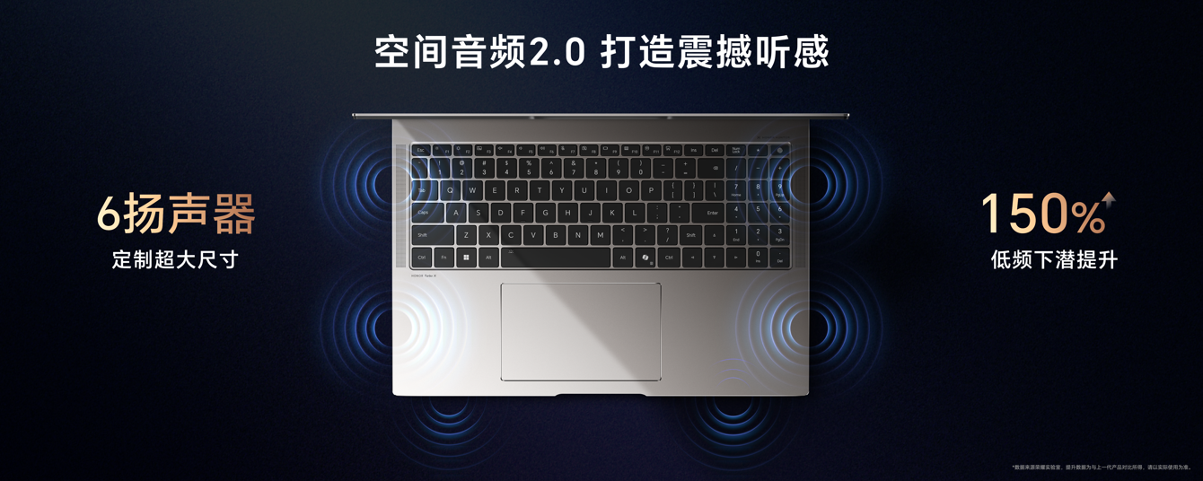 榮耀MagicBook Pro 16 2025空間音頻軟硬件全面升級,整機定製超大尺寸六揚聲器設計,低頻下潛提升150%,全新算法實現至高105°寬廣聲場,提供更震撼聽感。空間音頻2.0支持對FPS、賽車、MOBA等不同類型遊戲進行針對性的調校優化,帶來更精準的聽聲辨位,更強的沉浸感,讓用户深度體驗到遊戲細節。
