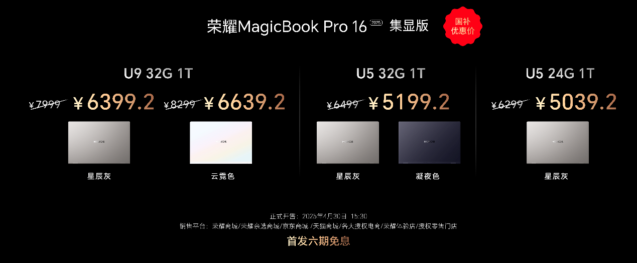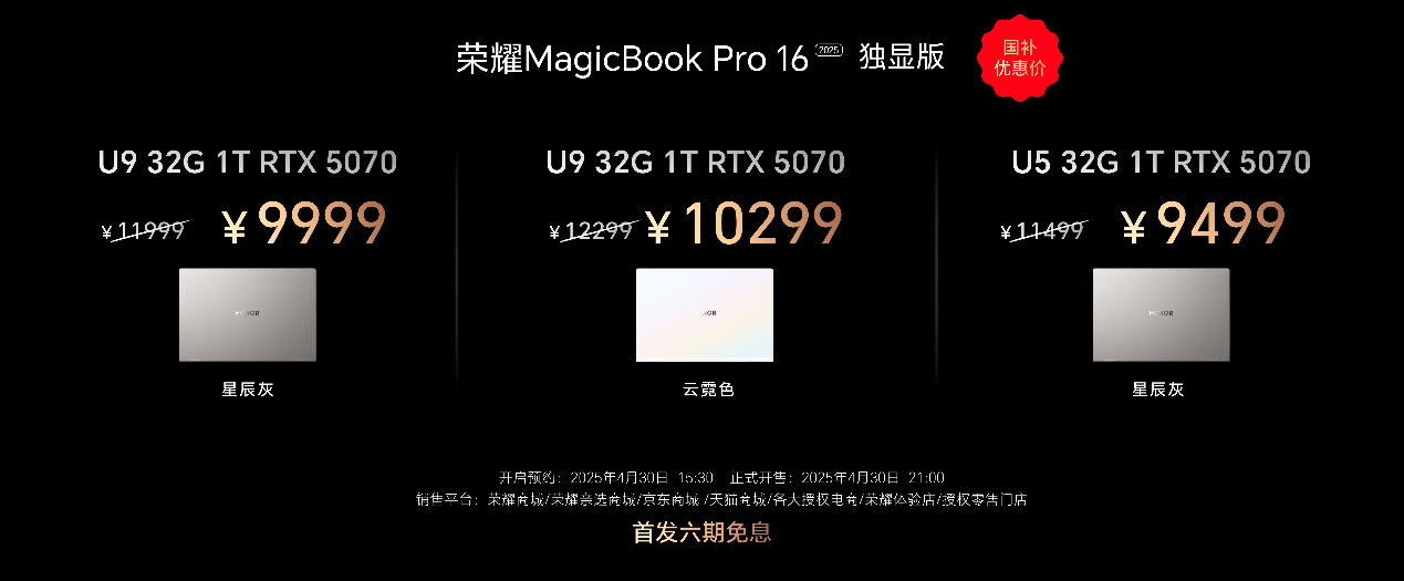 榮耀MagicBook Pro 16 2025提供獨顯和集顯兩種配置,滿足用户的不同預算需求。其中,搭載RTX 5070獨立顯卡的榮耀MagicBook Pro 16 HUNTER版2025國補到手價9499元起,4月30日21:00全渠道首銷;集顯版國補到手價5039.2元起,4月30日15:30全渠道首銷,想搶先體驗的用户可以抓緊時間入手。