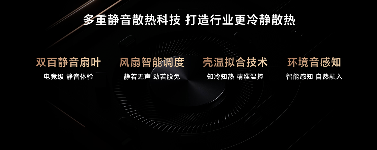 同時,產品採用全新榮耀智靜散熱設計,配備行業領先12mm大直徑複合3D隧道式熱管、12V電競級雙百葉靜音風扇、相變導熱材料、0.075mm超薄純銅散熱鰭片等散熱組件,搭配風扇智能調度、殼温擬合以及環境音感知等技術,打造行業更冷更靜的散熱體驗。