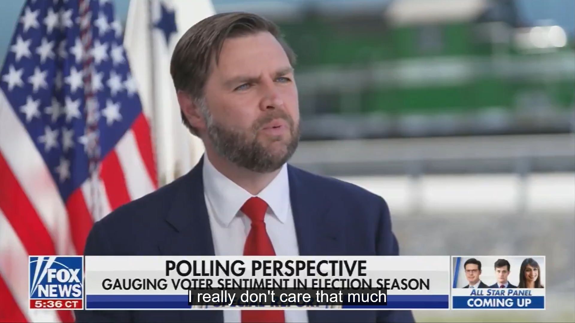 萬斯接着聲稱,在去年的美國大選中,“每個主流媒體民調機構”都預測前副總統、民主黨候選人哈里斯會贏下所有搖擺州,但特朗普還是贏得了大選。“我真的對民調持懷疑態度,”他説,“而且,即使民調準確,我也不怎麼在乎,因為如果我們做得好,人們會看到結果。”