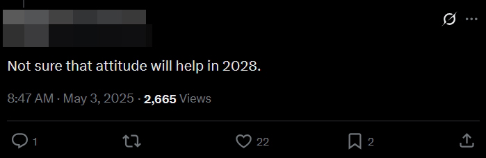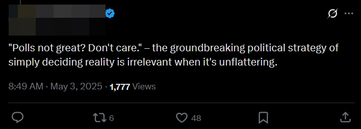 英國《獨立報》4日發現,萬斯這番説辭在社交平台上招致不少嘲諷。一名X(原推特)用户評論道:“不確定這種態度對2028年(大選)是否會有幫助。”另一名諷刺稱:“‘民調不好?不在乎。’——一種在現實不利的時候乾脆決定現實並不重要的開創性政治策略。”