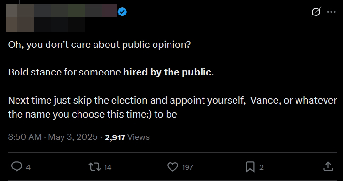 有人批評,作為一個民選官員,這種對公眾輿論毫不在意地姿態過於“大膽”。更有人直言:“你當然不在乎……但要是結果是另一種情況,你們早就拿出來大肆宣揚了!白宮裏的一羣小丑。”