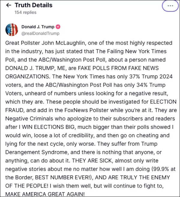 特朗普隨即在其自創社交媒體平台Truth Social上發文指控,這些數據都是“假新聞機構發佈的‘假民調’”。他指責民調機構和新聞媒體患有“特朗普精神錯亂綜合症”(Trump Derangement Syndrome),稱這些機構的負責人“應該因為選舉舞弊接受調查”。