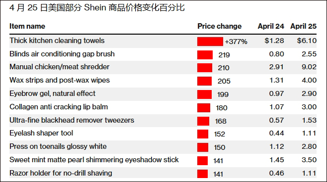 美國有線電視新聞網(CNN)和彭博社注意到,4月25日,Temu和Shein在新關税生效前提高了從草坪椅到泳衣等大量商品的價格。其中,Shein幾乎上調了平台內所有品類商品的價格,一些商品的價格甚至上漲了一倍多,廚房紙巾的價格漲幅最大,高達377%。