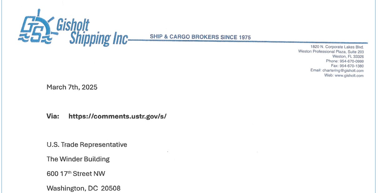 3月6日、8日,美國貿易代表辦公室舉行了兩天的聽證會。眾多航運企業、國際組織以及美國多個行業協會代表都提交了反對意見書。3月7日,佛羅里達一家名為“GisHolt”航運貨代公司的CEO HansLaue向美國貿易代表辦公室提交了一份意見書,這份簡短的意見書非常尖鋭、準確地批駁了美國貿易代表辦公室的調查文件以及擬議方案,可以説是人民的聲音。
