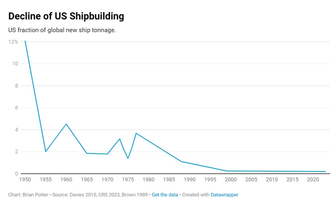 二戰結束後,美國控制的商船噸位佔到了全球的70%,這讓美國造船業的自信心膨脹到了極點。但這種靠戰爭特殊時期獲得的優勢不可能持久,也沒有商業上的可持續性。戰爭期間的成功反而掩蓋了美國造船業長期以來的問題,並使得美國造船業和美國政府有了不切實際的期望。