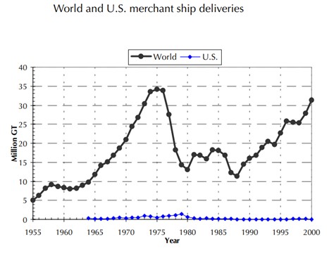 請願書先是哀嘆美國造船業輝煌不再,已經是虛有其表。二戰後直到1975年,美國曾擁有全世界最大的造船能力,而僅僅過去了50年,美國商業船塢減少了70%,失去了數萬工作崗位,目前美國的年商業造船量相比世界新增總噸位已經是微不足道了(0.1%)。