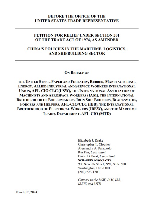 2024年3月12日,美國鋼鐵工人協會等5個工會組織向美國貿易代表辦公室遞交了一份請願書,要求根據1974年貿易法的301條,調查中國為主導的航運、物流及造船領域的有關不公平與歧視性政策行為。