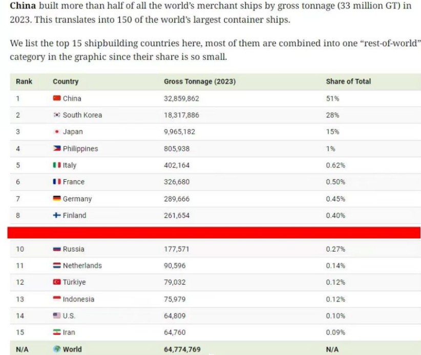 2023年,美國商船建造噸位在全世界僅僅排在14名(6.5萬噸),其同量級的全球競爭對手是印度尼西亞(7.6萬噸)和土耳其(7.9萬噸)。考慮到美國主要是為受保護的國內航運企業造船,對於國際航運市場,美國已經無能力參與競爭,調查一個本國不參與競爭市場的不公平行為,更顯得十分無理。無論按什麼標準,美國與中國(3286萬噸)根本不構成競爭關係,強行將中國列入競爭對手,甚至指控中國阻礙其發展,這隻能是嫉妒和仇恨驅動下的指鹿為馬,是栽贓陷害。