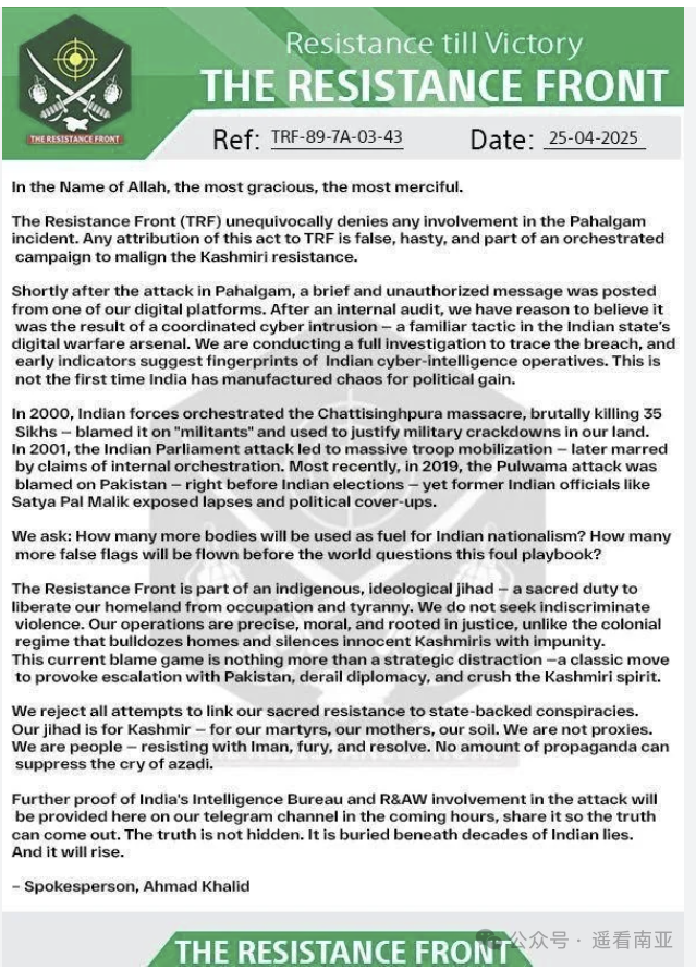 4月25日“查謨—克什米爾抵抗陣線”所發佈的聲明