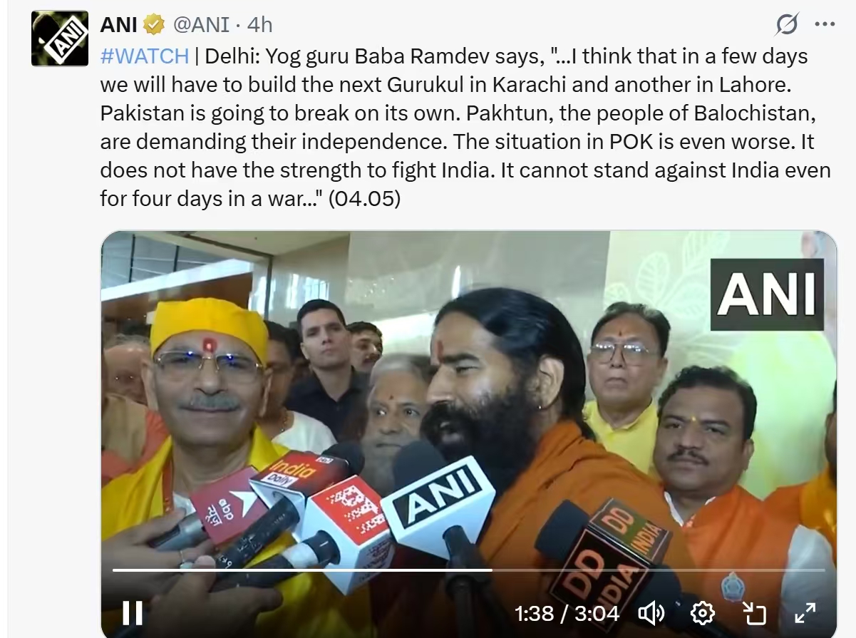 印度教主要傳教士兼著名瑜伽教練蘭德福(Swami Ramdev 或Yog guru Baba Ramdev)表示印巴若發生戰爭,印度將分裂巴基斯坦,並將在卡拉奇等地建立印度教學校古魯庫爾(Gurukul)