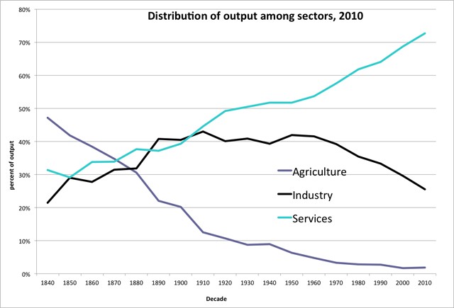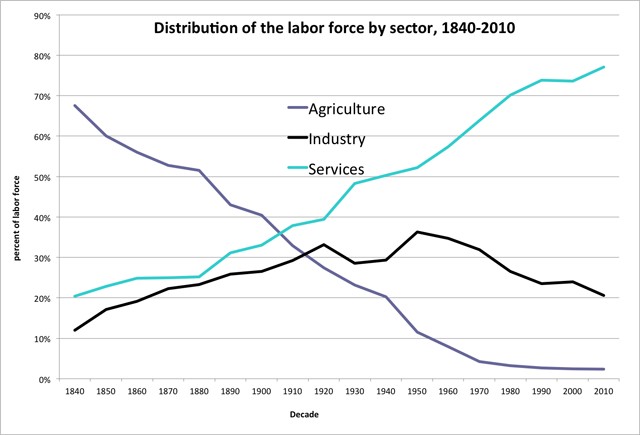 而這種製造業轉型到服務業的過程,整個美國都在發生。美國製造業的衰落不是從中國在21世紀成為世界工廠開始的,不是從20世紀末的全球化高峯開始的,而是要一直追溯到上世紀六、七十年代。
