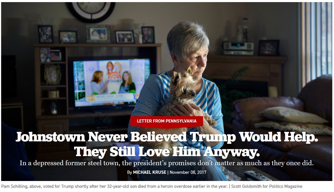 “Johnstown從來不相信特朗普能幫上忙,但不管怎樣他們仍然愛他——在抑鬱的/蕭條的前鋼鐵小鎮,總統的承諾不再像以前那樣重要……”