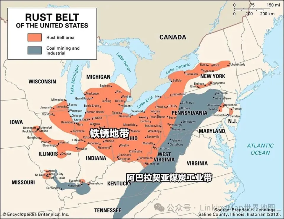 鐵鏽地帶範圍:大致從紐約州西部延伸到伊利諾伊、艾奧瓦邊界,阿巴拉契亞山脈的煤炭工業帶為工業帶提供了充足的能源