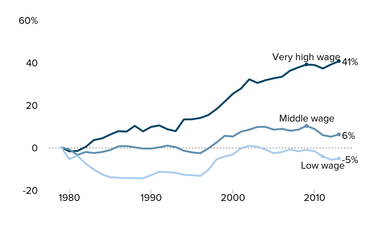 所以在近幾十年間,美國的經濟和就業雖然在增長,科技雖然在發展,但是對於普通勞動者來説,他們的實際工資是停滯甚至下降的: