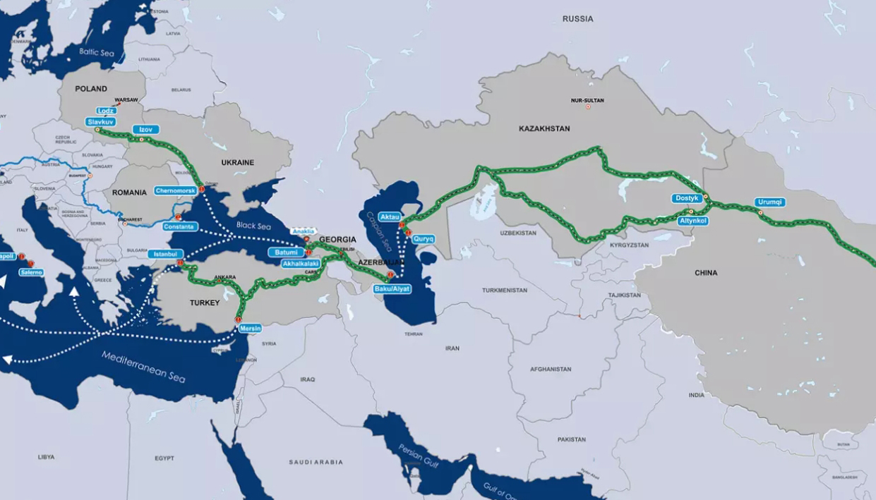 “中間走廊”計劃最早由土耳其於2015年提出,又名“跨裏海國際運輸走廊”(Trans-Caspian International Transport Route, TITR)計劃。該“走廊”以歐盟為起點,先經過土耳其和南高加索地區,然後在裏海通過輪渡抵達土庫曼斯坦和哈薩克斯坦,進而聯通其他中亞國家和南亞國家,最終抵達中國。中亞正好位於“中間走廊”的中段,是整條“走廊”不可或缺的交通樞紐。計劃提出後,不少沿線國家和地區紛紛響應,商討合作事宜。