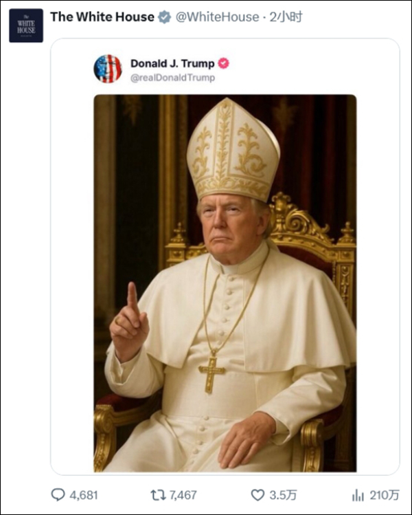 但5月2日,似乎還沒有死心的特朗普又在他的社媒賬號發佈了一張他身着教皇服的圖片,白宮隨後也轉發了這張被一些人稱為“特朗普教皇”的圖片。