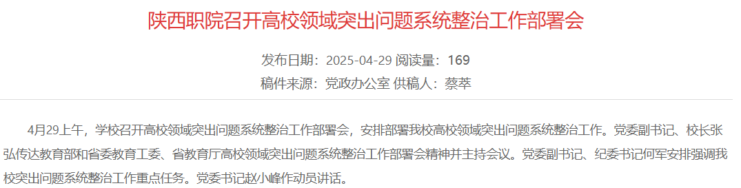 同日,陝西職業技術學院、濟南工程職業技術學院也均在官網發佈消息表示,學校召開了與“高校領域突出問題系統整治工作”相關的會議。在陝西職業技術學院的新聞稿中還提到,開展高校領域突出問題系統整治工作與落實教育部、省委教育工委、省教育廳高校領域突出問題系統整治工作部署視頻會議精神有關。