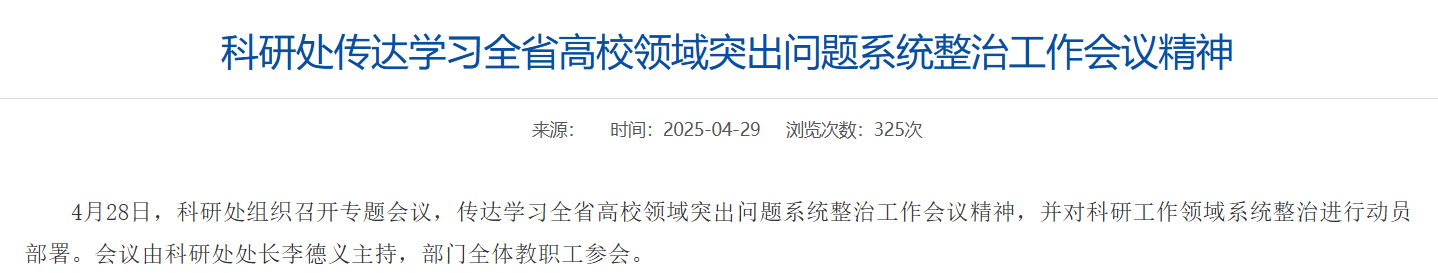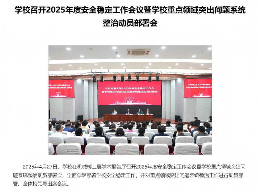 4月29日,北京交通大學在官網發佈消息稱,學校召開2025年度安全穩定工作會議暨學校重點領域突出問題系統整治動員部署會。會上校黨委副書記、紀委書記、巡察工作領導小組副組長王文文傳達了教育部相關會議精神,對學校重點領域突出問題系統整治工作進行動員部署。