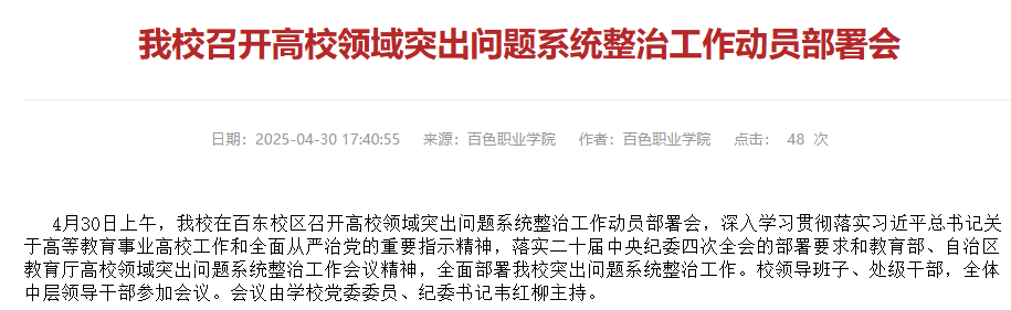4月30日,廣西百色職業學院也在官網發佈消息稱,學校召開了高校領域突出問題系統整治工作動員部署會,並稱該會議與落實二十屆中央紀委四次全會的部署要求和教育部、自治區教育廳高校領域突出問題系統整治工作會議精神有關。