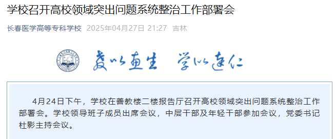 4月24日,長春醫學高等專科學校召開了高校領域突出問題系統整治工作部署會。根據該校微信公眾號消息,會上紀委書記張克強傳達了4月23日省教育廳組織召開的全省高校領域突出問題系統整治工作部署暨整改培訓會會議精神。張克強強調,各部門要提前做好籌備工作,學校紀委牽頭,各部門通力配合,按照省教育廳工作通知要求,結合學校實際,制定工作方案,抓好整治整改,確保系統整治工作高標準起步,高質量落實,營造積極健康風清氣正的教書育人環境。