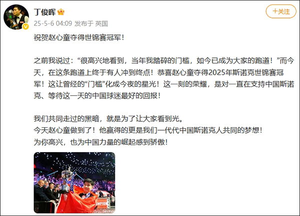 中國斯諾克選手@丁俊暉 5月6日發文向趙心童表示祝賀。