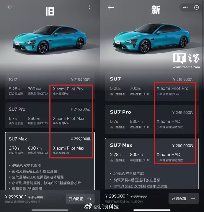 近日,小米汽車App顯示,小米SU7標準版搭載的Xiaomi Pilot Pro更名為“小米輔助駕駛Pro”,此前名為“小米智駕Pro”。同時,小米SU7 Pro、小米SU7 Max、小米SU7 Ultra搭載的Xiaomi HAD,更名為“小米端到端輔助駕駛”,此前名為“小米智駕Max”。