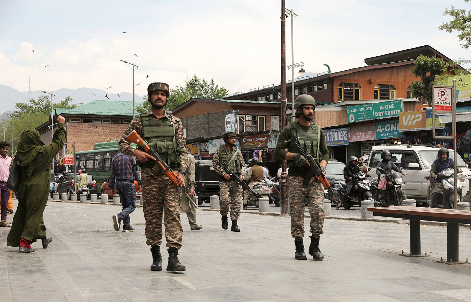當地時間4月24日,印控克什米爾首府斯利那加,槍擊事件發生後,印度士兵加強巡邏。 IC photo