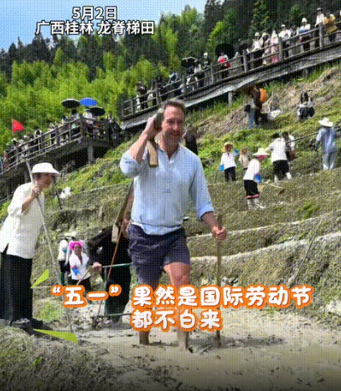 5月2日,外國遊客在龍脊梯田體驗農耕。視頻截圖