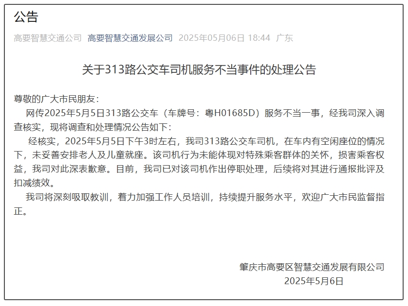 經核實,2025年5月5日下午3時左右,我司313路公交車司機,在車內有空閒座位的情況下,未妥善安排老人及兒童就座。該司機行為未能體現對特殊乘客羣體的關懷,損害乘客權益,我司對此深表歉意。目前,我司已對該司機作出停職處理,後續將對其進行通報批評及扣減績效。