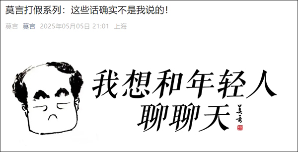 5月5日,作家莫言在其微信公眾號發文,回應網友提問,並在線打假:這些話確實不是我説的。