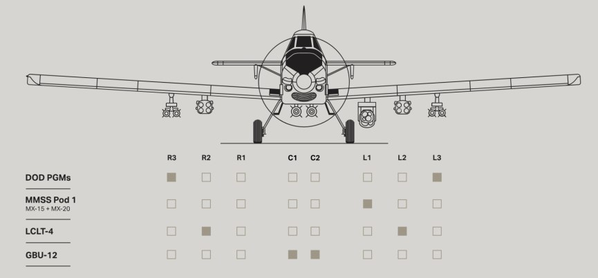 今年年初,OA-1K被授予“天襲者Ⅱ”的綽號時,美國空軍作戰司令部戰略計劃、項目和需求主任克雷格·普拉瑟准將表示,該機除在非洲各地的行動外,還有可能在美國西南部和墨西哥的邊境地帶執行任務,特別是可以作為目前廣泛使用的MQ-9“死神”無人機的低成本替代品。因此在初期這種低烈度任務預想下,OA-1K的典型任務載荷包括AGM-114“地獄火”空地導彈、APKWS Ⅱ 70毫米激光制導火箭彈、500磅GBU-12激光制導炸彈和響應的吊艙傳感器、空射無人機等配置。
