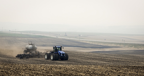 加拿大農民駕駛着播種機在家庭農場種植油菜籽作物。 視覺中國