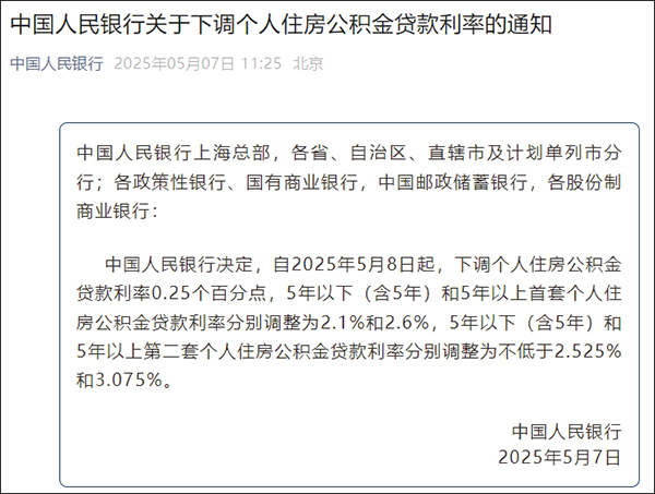 中國人民銀行決定,自2025年5月8日起,下調個人住房公積金貸款利率0.25個百分點,5年以下(含5年)和5年以上首套個人住房公積金貸款利率分別調整為2.1%和2.6%,5年以下(含5年)和5年以上第二套個人住房公積金貸款利率分別調整為不低於2.525%和3.075%。