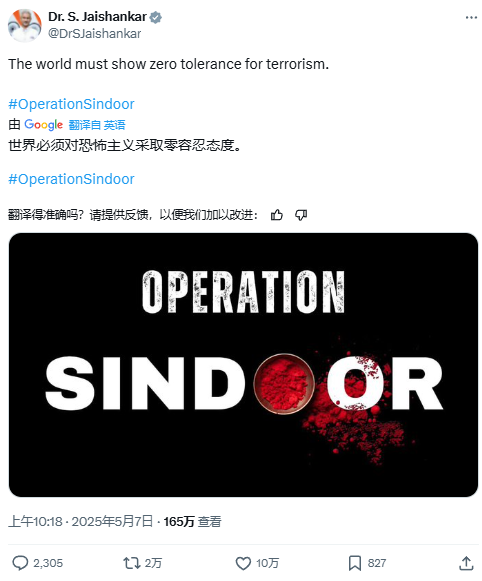 在印度軍方發起行動後,印度外交部長蘇傑生在社交媒體“X”上發佈了一張帶有“辛杜爾行動”文案的圖片,上面還帶有標誌性的紅色粉末。蘇傑生還用英語寫到:“世界必須對恐怖主義採取零容忍態度。”
