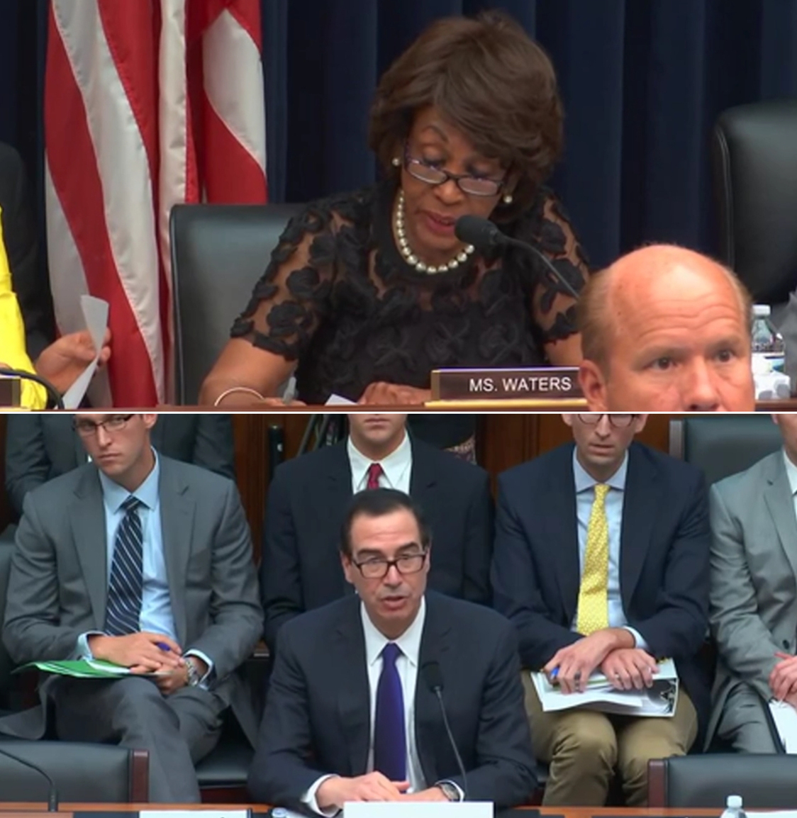 2017年,當時同樣是美眾議院金融服務委員會召開的一場聽證會,小組高級成員、民主黨人沃特斯(Maxine Waters)提問關於特朗普與俄羅斯銀行關係的問題時,剛上任半年的姆努欽在直接回答問題之前説了一堆客套恭維沃特斯的廢話。