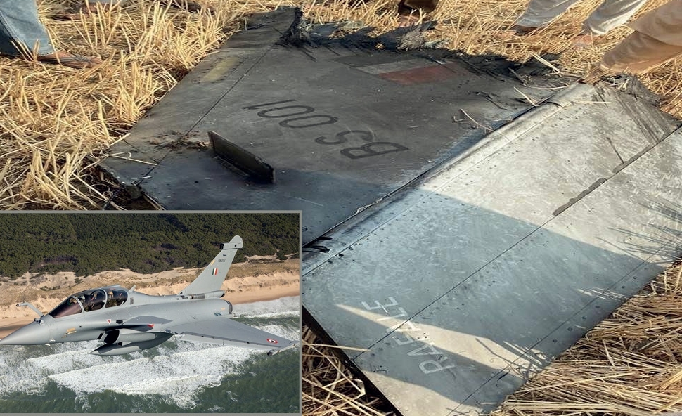 印軍接收的首架編號為BS001的“陣風”戰機,以及社交媒體流傳的疑似該機垂尾殘骸。 社交媒體