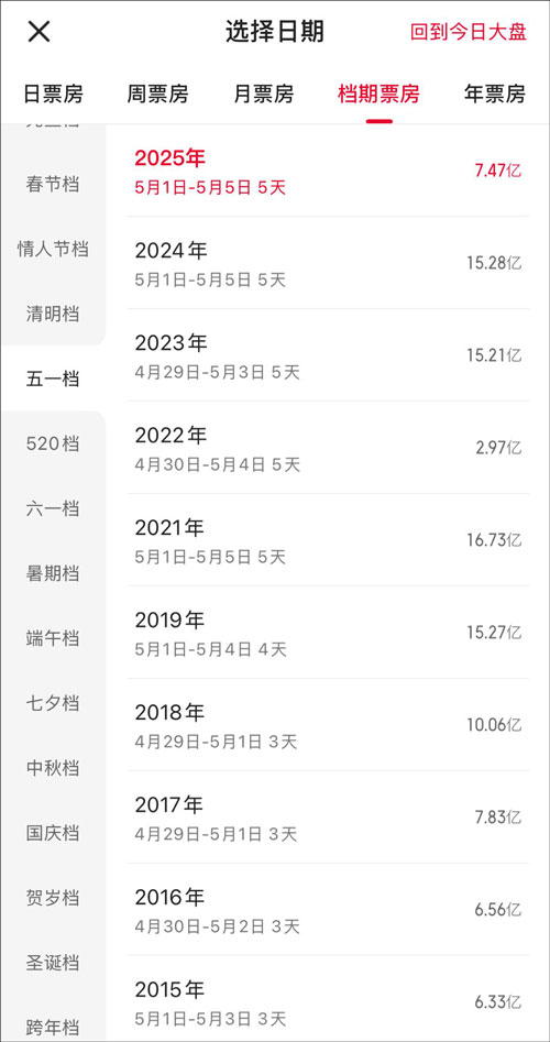 2015-2025年中國內地“五一”檔電影總票房 貓眼專業版