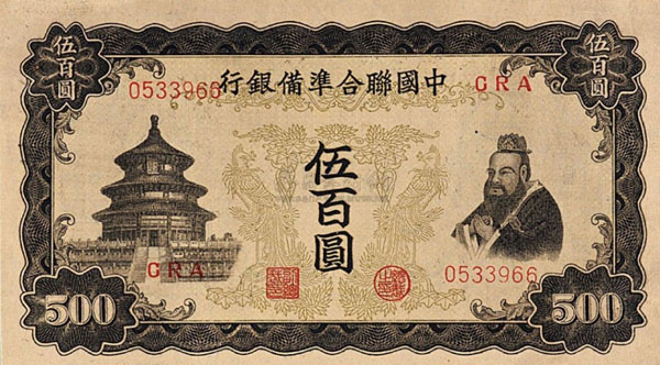1938年,由偽“中華民國臨時政府”財務總署督辦汪時璟出面,創辦偽“中國聯合準備銀行”,圖為該行發行的500元紙鈔