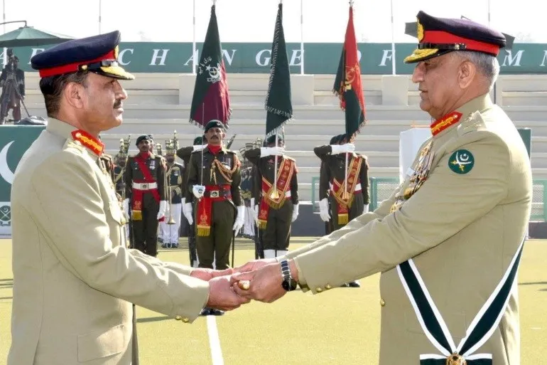 2022年,在巴基斯坦拉瓦爾品第軍事總部舉行的儀式上,即將卸任的陸軍參謀長卡馬爾·賈韋德·巴傑瓦將軍(右)將指揮棒移交給阿西姆·穆尼爾將軍。資料圖:路透社