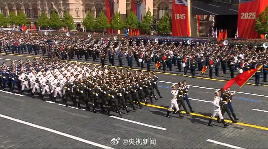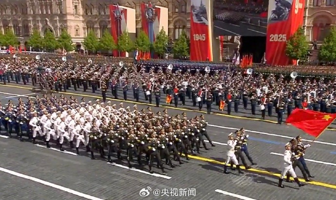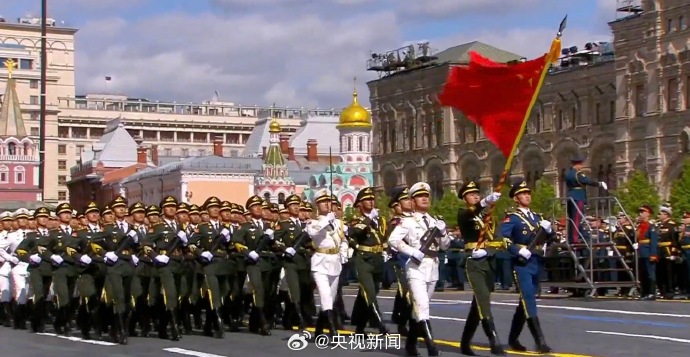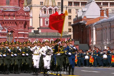“放心吧祖國!放心吧親人!為了勝利我要勇敢前進!”中國人民解放軍儀仗司禮大隊在紅場閲兵入場前,高唱《當那一天來臨》,激昂的歌聲響徹莫斯科上空。