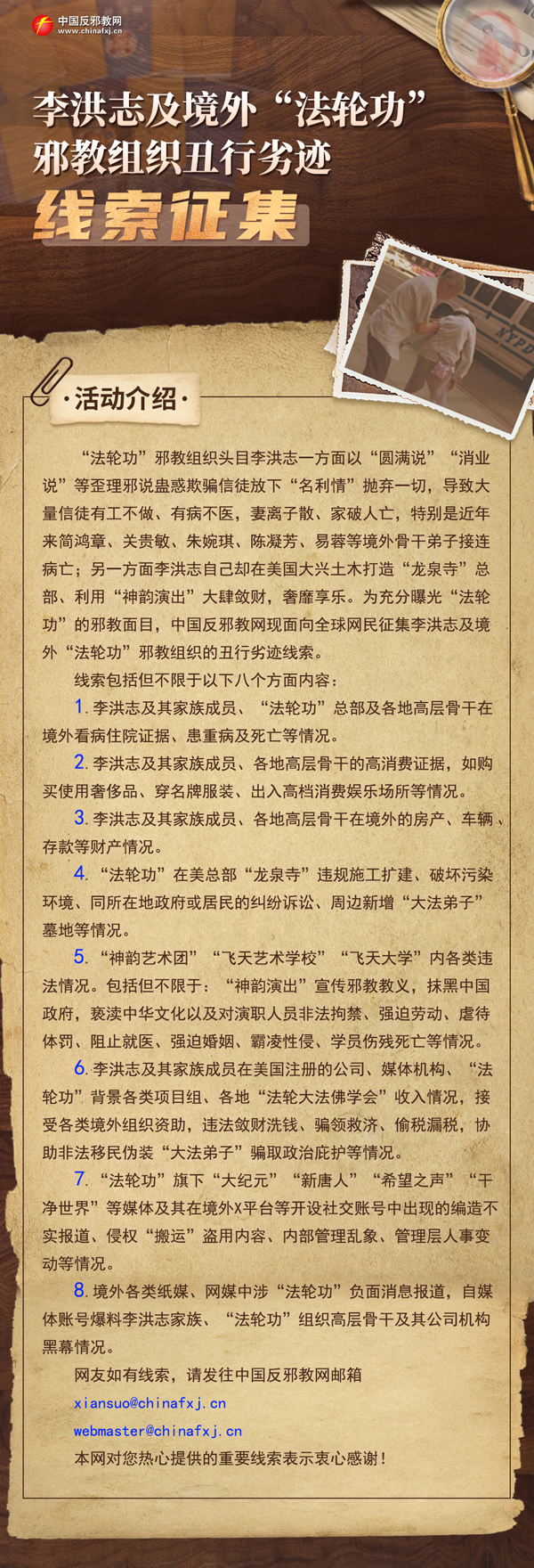 2025年4月25日,中國反邪教網發佈針對李洪志及其“法輪功”邪教組織醜行劣跡的線索徵集令,再次收到熱心網友提供的境外“法輪功”骨幹楊森死亡的信息。