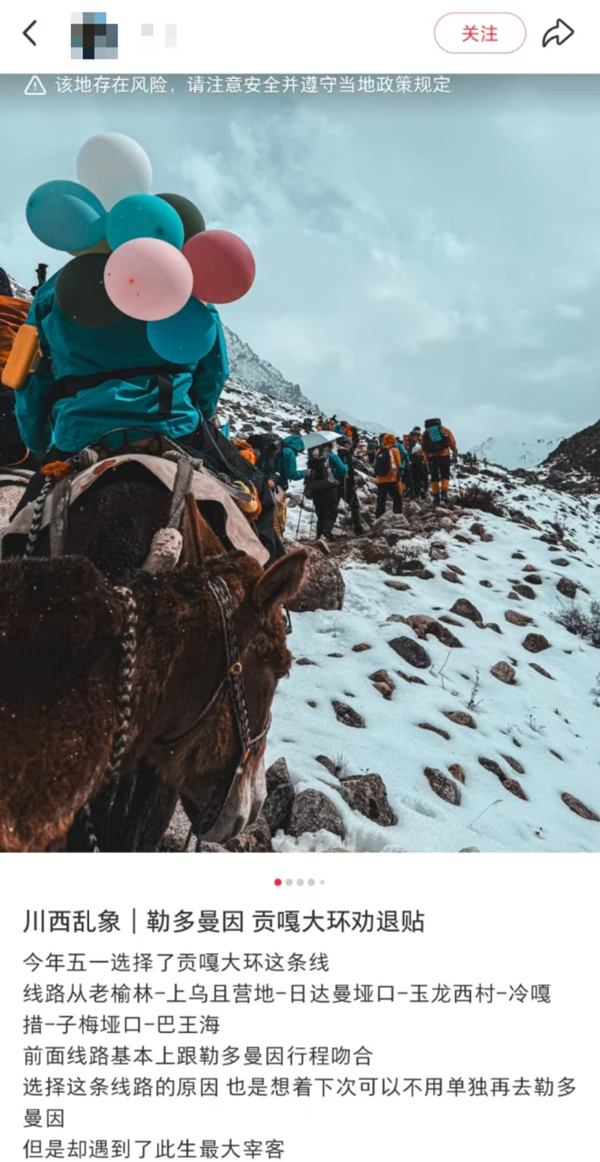 “這次勒多曼因封山不是因為出事,應該是被投訴了。”“桃子”介紹,去年開始勒多曼因爆火,只要節假日就是“萬人攻打”,營地接待量增加,很多户外小白進來,走不動或者高反的都需要騎馬,“五一期間一路上看到好多嘴唇發紫走到一半就癱着的小夥伴,而馬太少,要騎馬的太多,也讓馬幫的供需關係改變。”