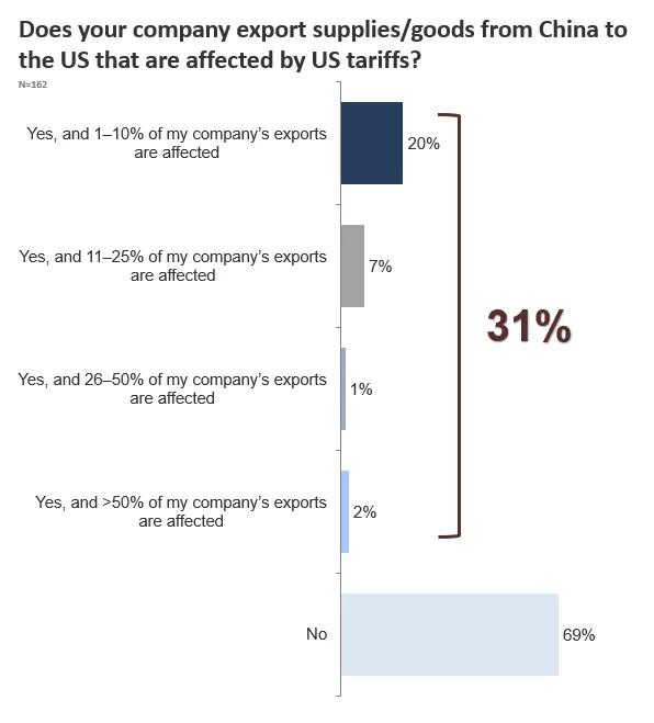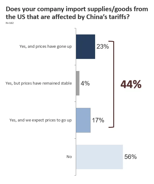 本次調查還顯示,近半數受訪會員受到了中國對美國商品加徵關税的影響。其中,23%受訪者表示價格有所上升。4%受訪者表示雖然受影響,但價格仍保持不變。17%受訪者預期價格將上漲。