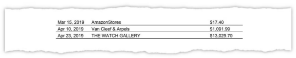 對賬單顯示,在倫敦的手錶畫廊(Watch Gallery)消費了13,029.70美元,在Hugo Boss購買羊毛西裝及其他衣物消費了10,000美元,在奧地利的愛馬仕店花費了2,045.31美元,在瑞士的梵克雅寶(Van Cleef & Arpels)珠寶店花費了1091.99美元。