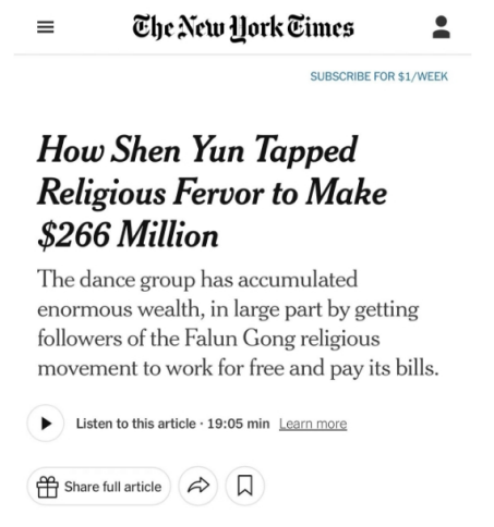 2024年12月29日,美國《紐約時報》發表深度報道《“神韻”如何利用信徒狂賺2.66億》一文,報道以梁先生母親為例,指出“神韻”積累的鉅額財富,絕大部分來自於“法輪功”信徒的免費工作及賬單支付。梁母的故事令人悲慟:她和丈夫賣掉房子,將賣房款悉數捐給了“法輪功”;不但自己替“法輪功”無償服務,還將子女送到“山上”參加“神韻”表演。梁母雖然為李洪志及其“法輪功”百般賣命,但並未獲得自己想要的,反而罹患腎癌,醫療費用高達數萬美元。就在梁母因錢財盡數給了“法輪功”而無力承擔這筆救治費用只能忍受疾病痛苦時,李洪志和他的妻子卻用梁母的賬户購買了數萬美元奢侈品。2019年10月,被病痛折磨至僅31.75公斤的梁母撒手人寰。