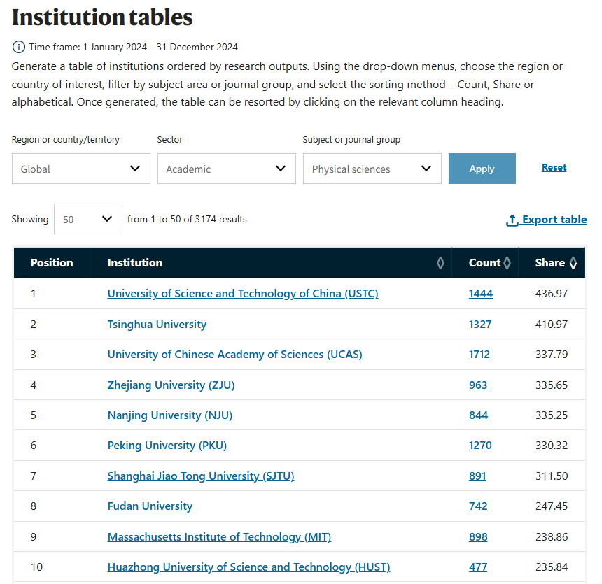 “自然指數”列出的2024年度物理科學領域全球高校的科研產出排名