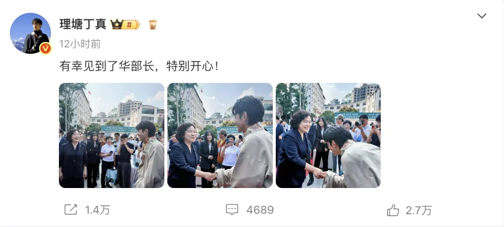 5月9日,演員理塘丁真發佈微博稱“有幸見到了華部長,特別開心”。