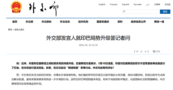 據外交部網站消息,外交部發言人就印巴局勢升級答記者問。