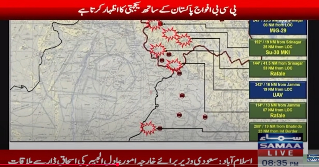 喬杜裏還介紹了擊落印軍戰機的具體位置。他説,第一架 “陣風” 戰機在距離控制線53英里處(約93.3千米),靠近斯利那加的地方被擊落。另外兩架“陣風”分別在距離控制線7英里(約11.2千米)的查謨附近和距離邊境23英里(約37千米)的巴廷達附近被擊落。